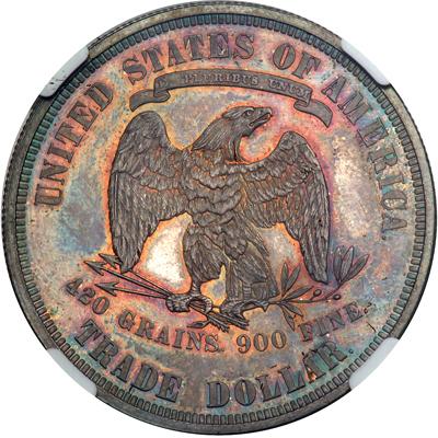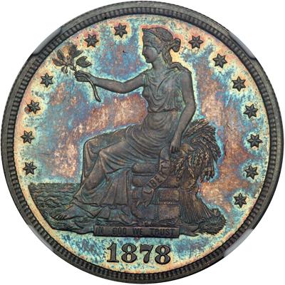 1878 Trade Dollar. NGC graded Proof 65. Lovely blue and gold toning. 900 Proofs minted for this Proof only year. It is difficult for us to pick a starting point for our assessment of this coin's wonderful merits, as they are extend right across both sides of the coin. The first point that will almost certainly greet the viewer is the colorful toning. As viewed in the photographs, the hues are richly saturated, watery (from the reflective fields) and pose a satiny contrast from the almost matte-like devices. The latter features are keen-edge and sharp throughout. Furthermore, all areas are silent on the subject of spots and marks. The coin is a rip-roaring Gem Proof! Beautiful in all regards, this coin would serve as a pride and joy in any collection, above all a better-date Proof Type set of top quality. Pop 38; 10 in 66; 4 in 67. In a new NGC 4 pronged holder.