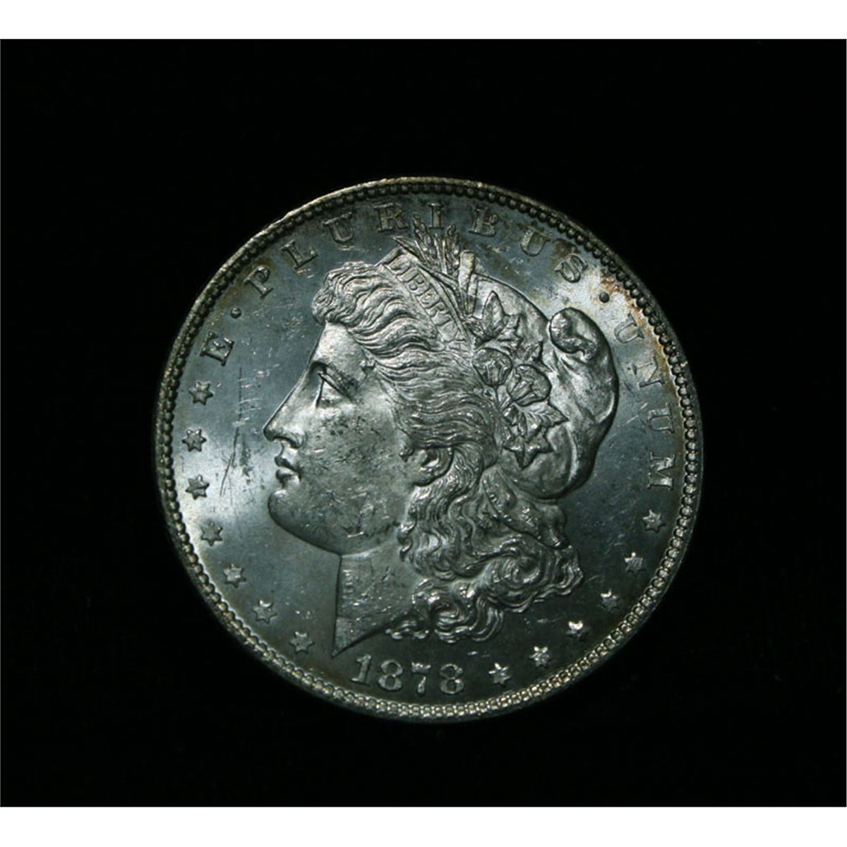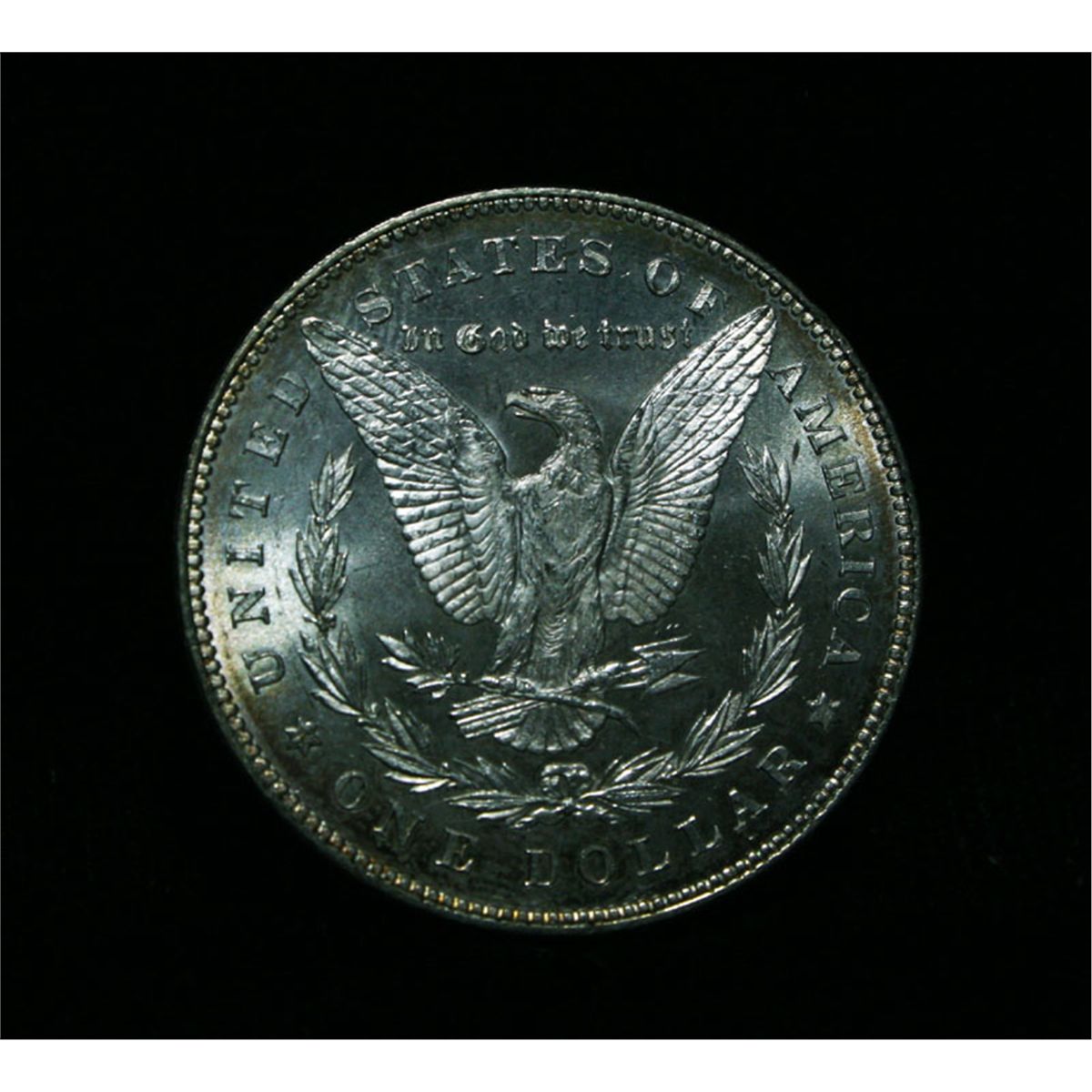 A nice white example of the first year of the Morgan dollar series with a bit of rim toning. This is the VAM 132 with the missing nostril. The Wholesale Greysheet lists ms64 at $200. Estimated Value $225
