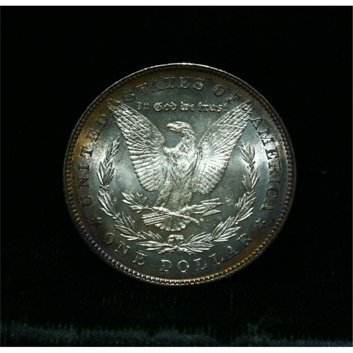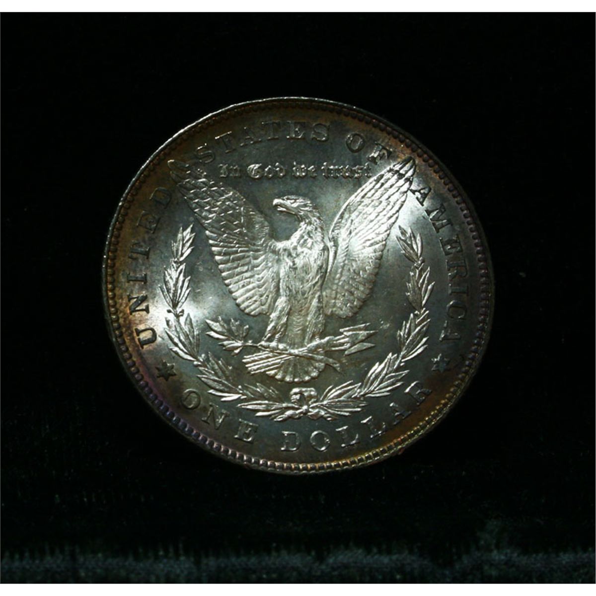 A beautiful example of the first year of the Morgan dollar series. The obverse has pretty pastel toning with green, purple and bronze. The reverse has beautiful rim toning with purple, bronze, blue and red. NGC's Price Guide lists ms64 at $244 and The Wholesale Greysheet lists ms64 at $200. Estimated Value $225