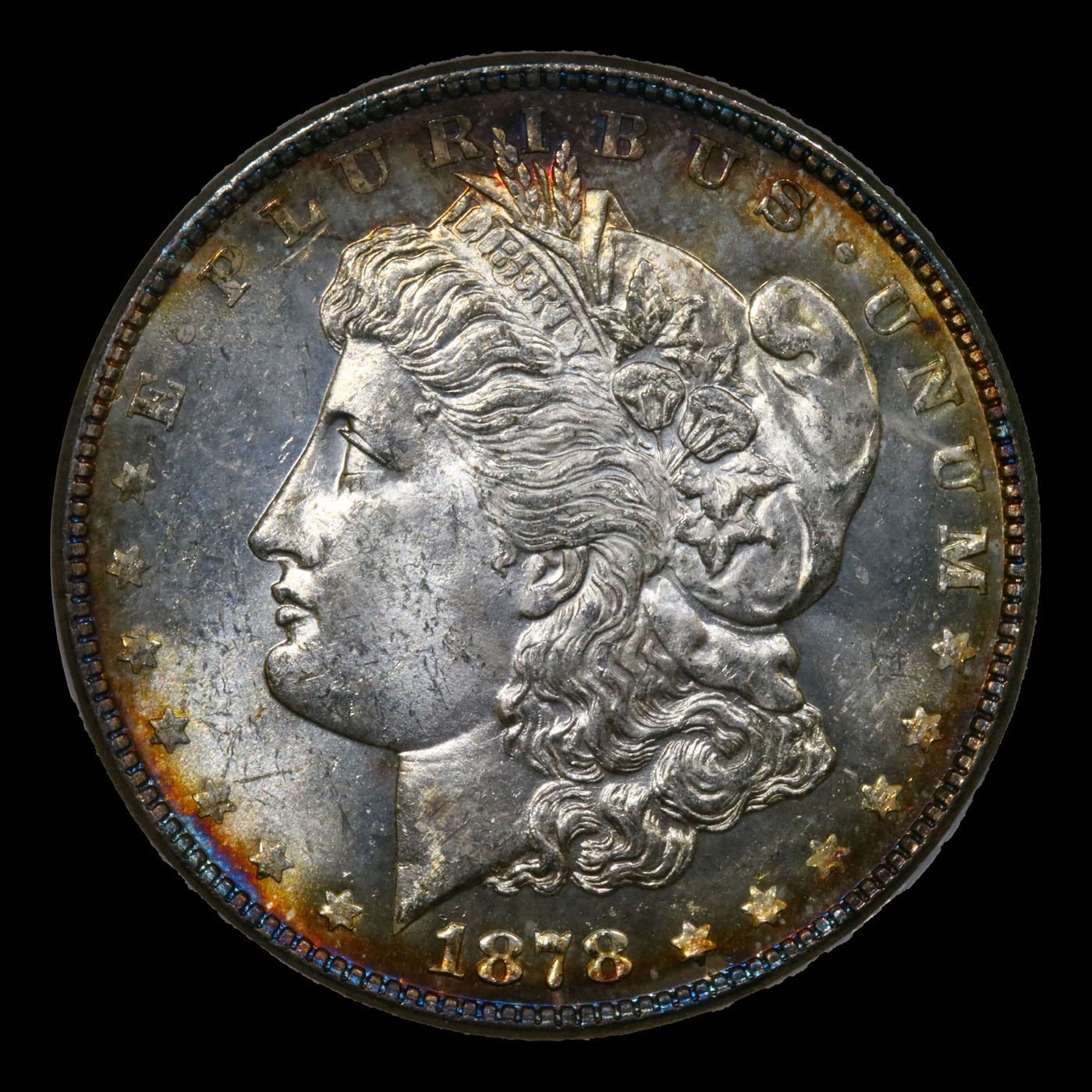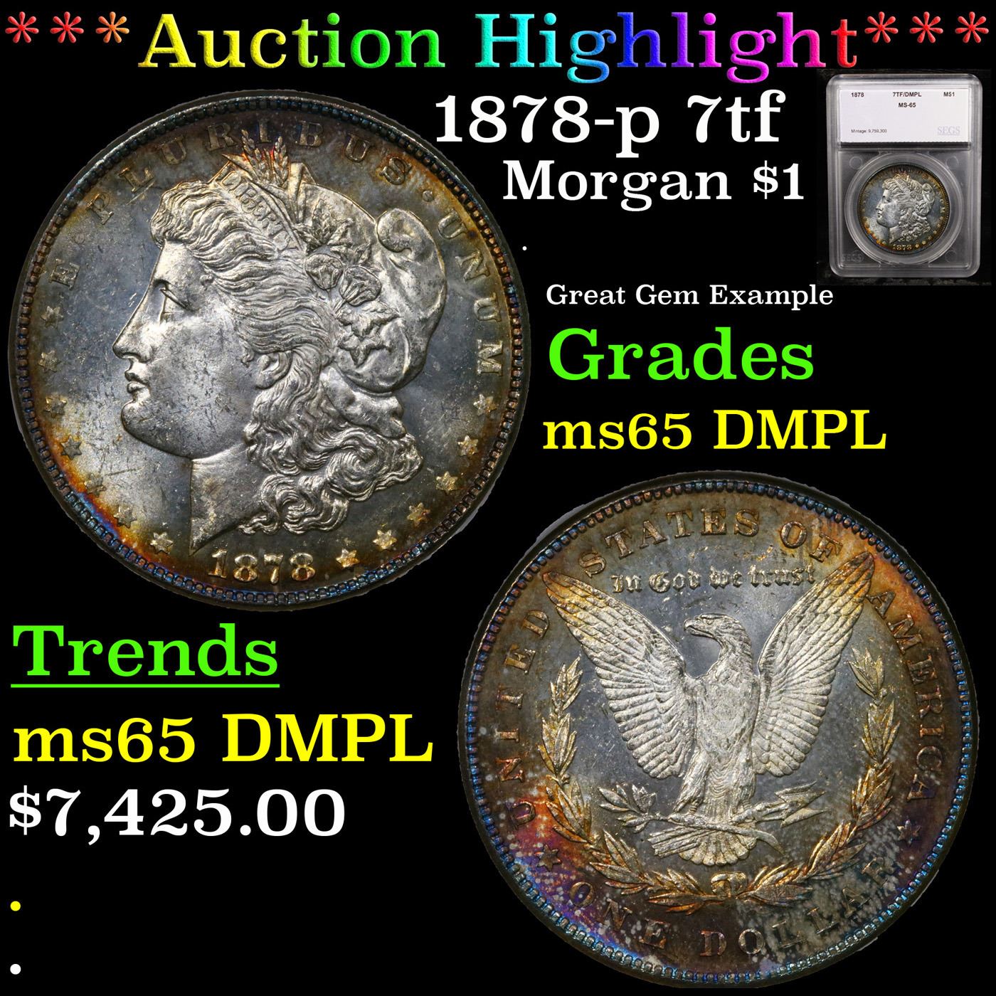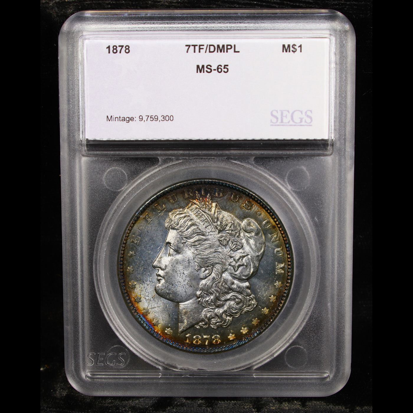 1878-p 7tf Morgan Dollar $1 Graded ms65 DMPL BY SEGS. An angelic, rainbow toned complexion gleams back at the viewer of this gorgeous prooflike Gem. The fields on each side are deep and heavily mirrored, contrasting with the richly frosted devices, most notably so on the obverse. Lacking in noteworthy abrasions of any sort, this piece sits among the finest survivors of the issue. A Corey's Pick, Bid to Win, Don't let it get Away, you might not find its equal Coin