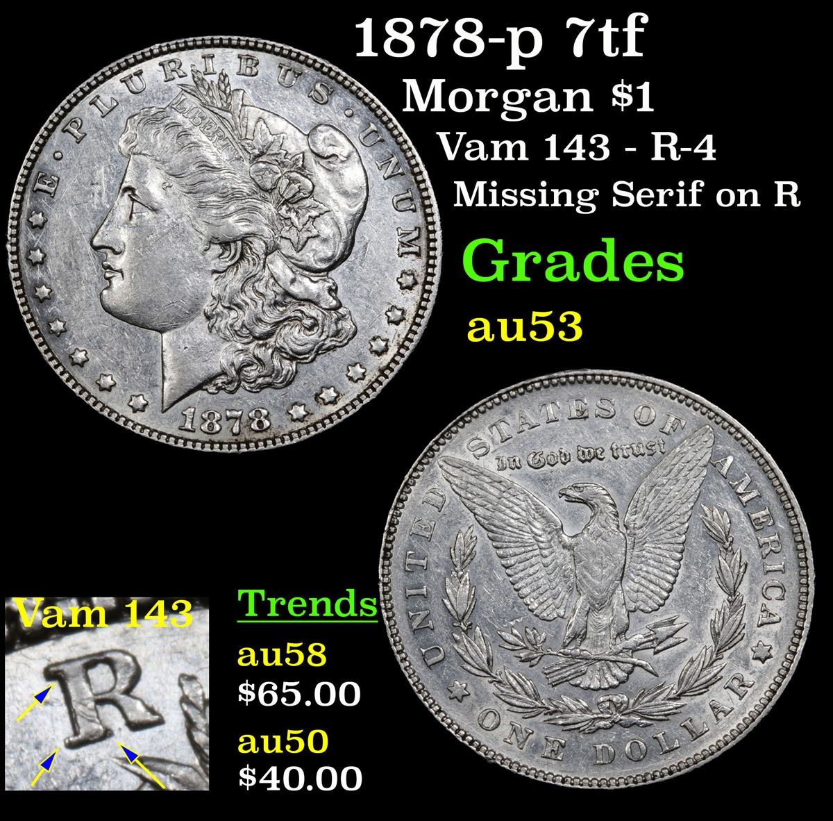 1878-p 7tf Morgan Dollar $1 Grades Select AU.