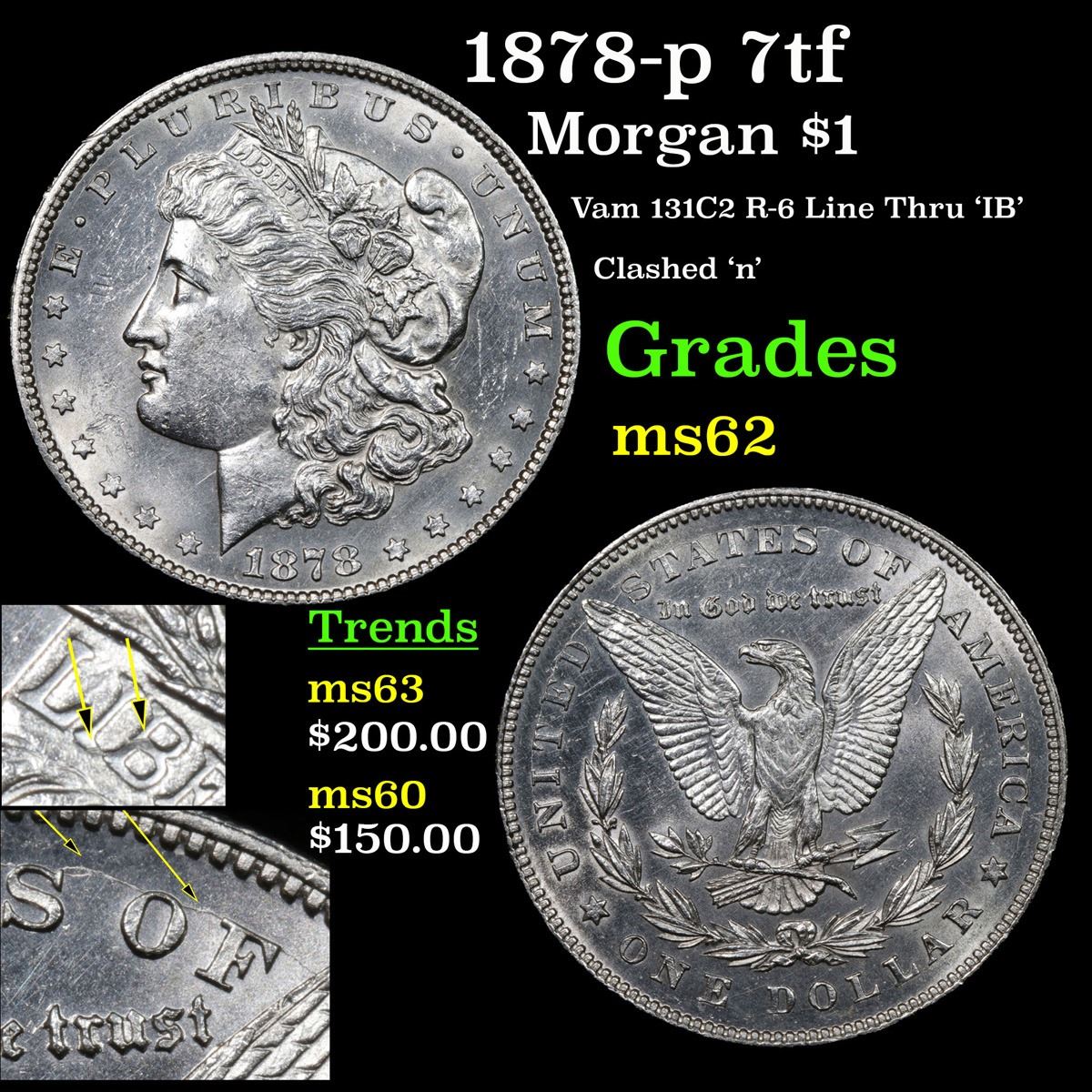 1878-p 7tf Vam 131C2 R-6 Line Thru 'IB' Clashed 'n' Morgan Dollar $1 Grades Select Unc.