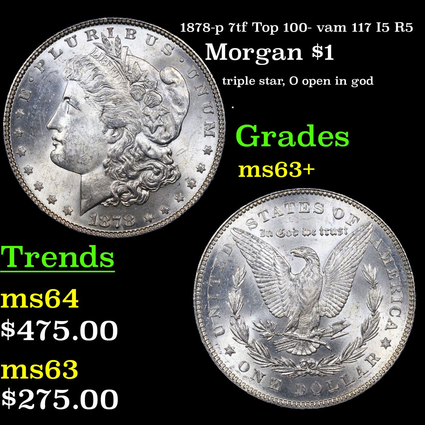 1878-p 7tf Top 100- vam 117 I5 R5 Morgan Dollar $1 Grades Select+ Unc.