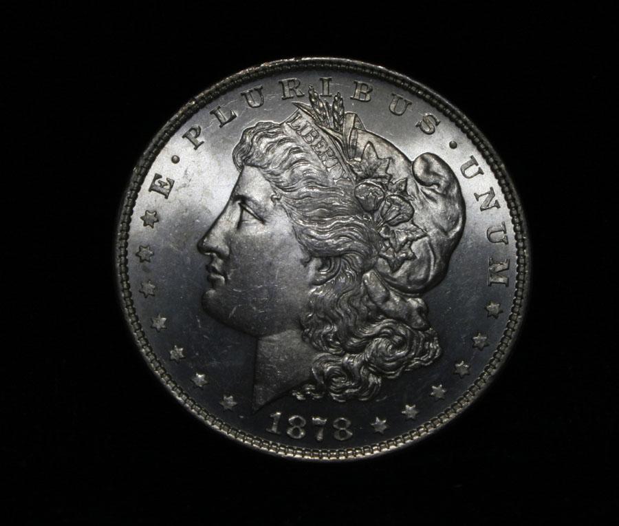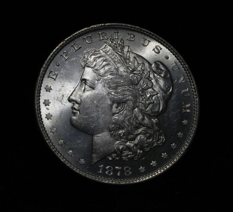 A gorgeous example, very pleasing to the eye. Great Luster and great strike. This is the 1st Morgan dollar. The 8TF reverse is the 1st of the 4 reverses used in 1878. A near perfect example of this sought after coin. This is the VAM 3, with the strongly doubled reverse. Rarity 4. Coin World's Coin Values lists ms65 at $1500 and The Wholesale Greysheet lists ms65 at $1270. Estimated Value $1300