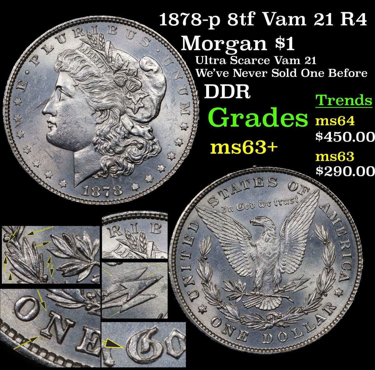 1878-p 8tf Vam 21 R4 Morgan Dollar $1 Grades Select+ Unc. Up for Auction is the ultra rare Vam 21. His is an 8tf Variety which we have never brought to auction. The vam 21 has a reverse die that is unique to the vam 21, and was not used on any other vam. Wild doubling throughout. I have included several of the most wild aspects, but you really must see it in hand. A Corey's Pick