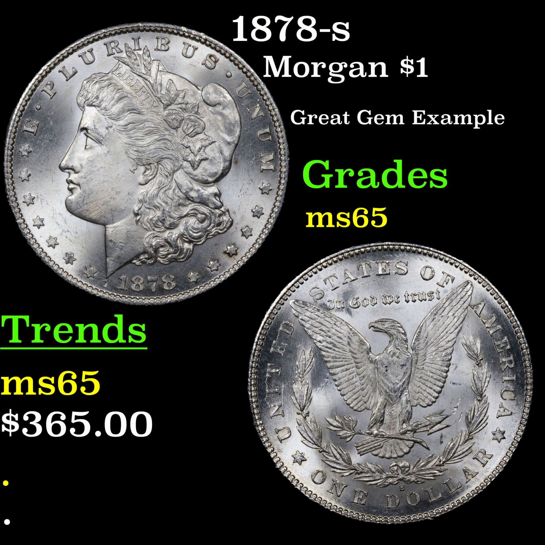 1878-s Morgan Dollar $1 Grades GEM Unc. Slightly better date. First year of issue. Faint roller marks on each side remain from the original planchet preparation before this piece was struck.