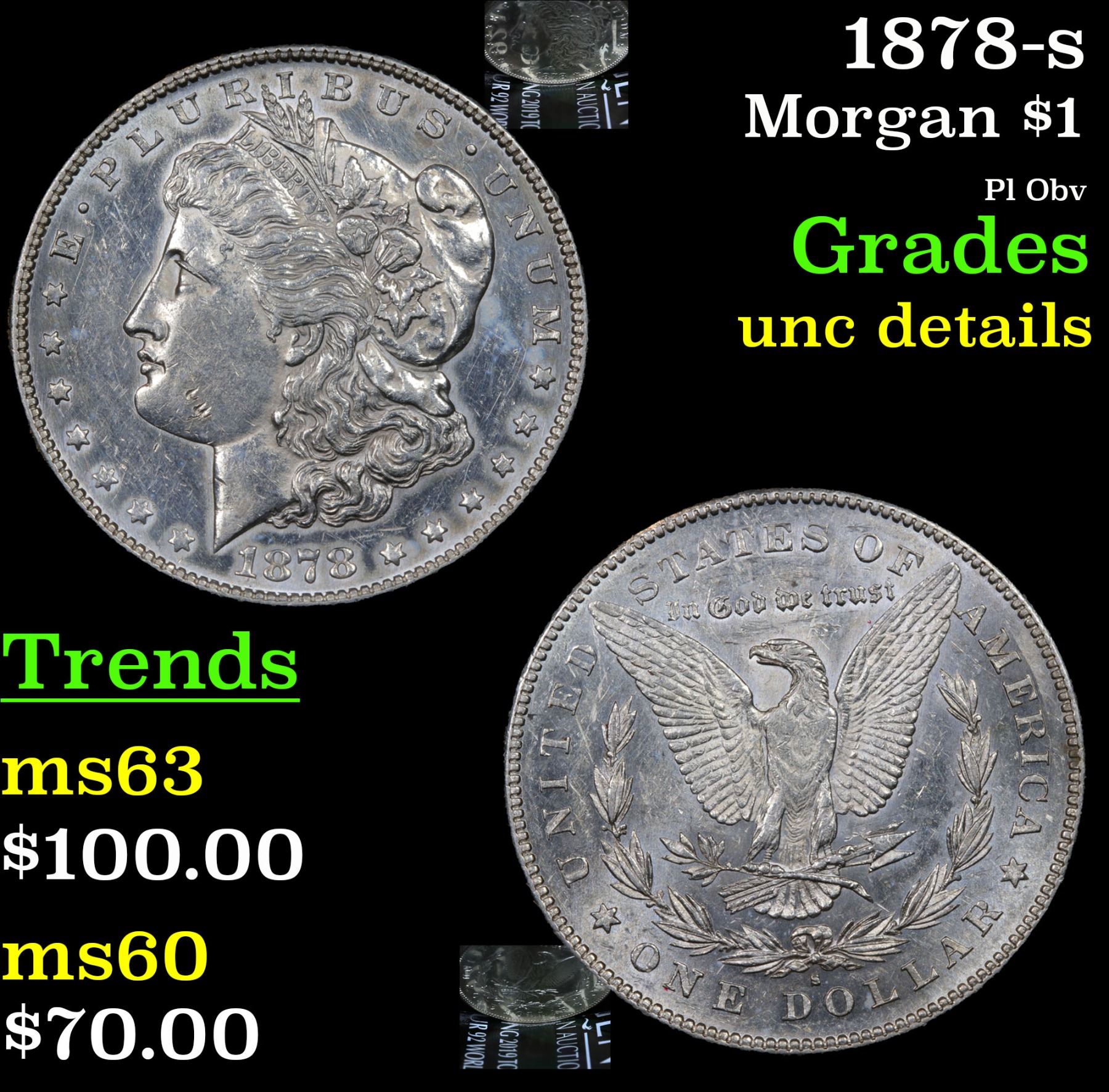 1878-s Morgan Dollar $1 Grades Unc Details. Slightly better date. First year of issue.