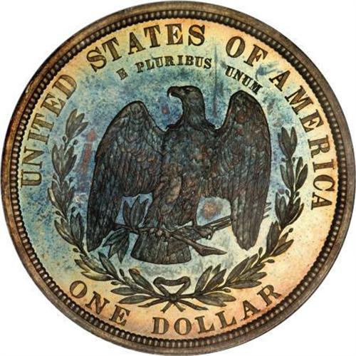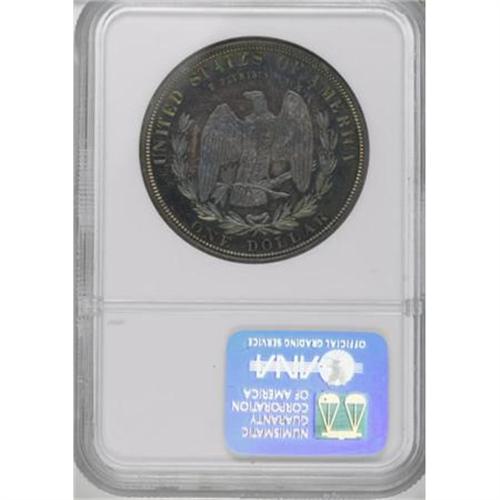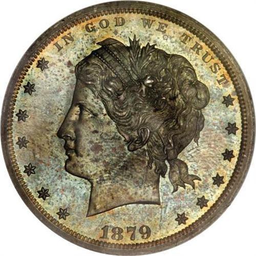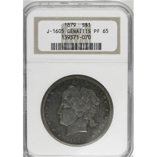 <B>1879 $1 Dollar, Judd-1605, Pollock-1801, Low R.7, PR65 NGC.</B></I> Ex: Genaitis. This design is similar to Charles Barber's "Washlady" design with Liberty facing left, her hair bound behind the head. IN GOD WE TRUST appears above the head with the date below, seven stars to the left, and six to the right. A spread wing eagle is in the center of the reverse with a laurel wreath around the eagle, E PLURIBUS UNUM above and ONE DOLLAR below. The statutory legend follows the upper border. Struck in silver with a reeded edge. In the Garrett catalog, offering this identical specimen, Dave Bowers wrote: "This design by William Barber is one of several attempts to provide a more satisfactory design for the silver dollar than that prepared by the young and relatively inexperienced engraver George T. Morgan." A stunning example that features deep steel-gray color on the obverse, intermingled with sea-green and gold toning. The reverse displays a lovely blend of sea-green, gold, and magenta color.<BR><I>Ex W. Elliot Woodward (8/18/1883); Garrett Collection (Bowers and Ruddy, 3/1980), lot 1055; Superior (1/1990); Genaitis Collection (Heritage, 8/2001), lot 8395.</B></I><BR><BR><b>Shipping:</b> Coins & Currency (<a target="_blank" href="http://www.heritageauctions.com/common/shipping.php">view shipping information</a>)