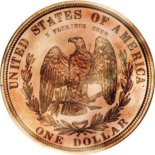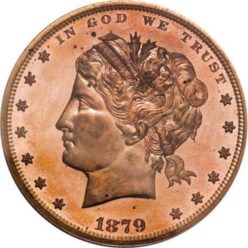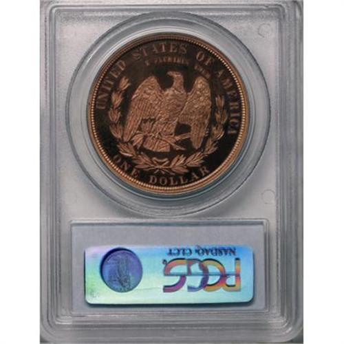 <B>1879 $1 Dollar, Judd-1606, Pollock-1802, Low R.7, PR64 Cameo Red PCGS.</B></I> William Barber's entry in the 1879 silver dollar pattern series is less known than either Morgan's "Schoolgirl" dollar (Judd-1608) or Charles Barber's "Washlady" motif (Judd-1603). But Judd-1606 is a better value, trading at significantly lower levels despite its slightly greater rarity (Judd-1603 and Judd-1608 are High R.6, per the ninth edition of Judd). The obverse features a relatively small bust left of Liberty, her hair bound by a ribbon. The reverse depicts a perched eagle with unfolded wings. The eagle's claws clutch an olive branch and three arrows, and the eagle hovers above a laurel wreath. Struck in copper with a reeded edge.<BR> This is a prominently mirrored near-Gem with rich peach-red color and undisturbed surfaces. The strike is needle-sharp, and the eye appeal is superior for the grade. A few distributed toning flecks are of little import.<BR><I>From The Pelican Bay Collection of Pattern Coins.</B></I><BR><BR><b>Shipping:</b> Coins & Currency (<a target="_blank" href="http://www.heritageauctions.com/common/shipping.php">view shipping information</a>)