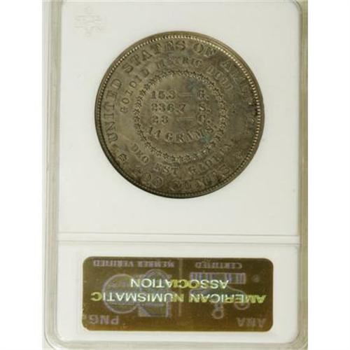<B>1879 $1 Goloid Metric Dollar, Judd-1626, Pollock-1822, R.4, PR62 ANACS.</B></I> William Barber's design for the Goloid Metric dollar with a capped head of Liberty on the obverse, paired with a reverse that carries verbose statutory as well as elemental inscriptions. A circle of stars about the central inscriptions breaks the otherwise continuous wording. Struck in goloid (5.46% gold, 84.54% silver, 10.00% copper) with a reeded edge. Golden-brown, ice-blue, and olive toning grace this well struck example. In an old ANA cache holder.<BR><BR><b>Shipping:</b> Coins & Currency (<a target="_blank" href="http://www.heritageauctions.com/common/shipping.php">view shipping information</a>)