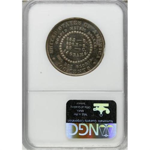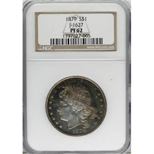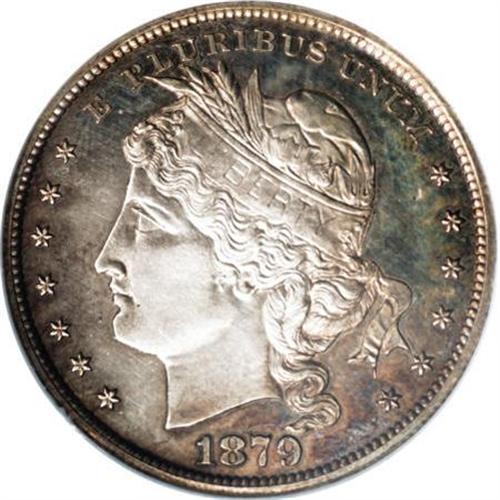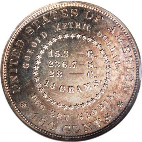 <B>1879 $1 Goloid Metric Dollar, Judd-1627, Pollock-1823, R.5, PR62 NGC.</B></I> The obverse features a bust of Liberty by William Barber. She wears a large cap with cereal grains, and her curls are bound by a ribbon. The reverse displays eight separate legends that state the value, weight, and alloy. Struck in silver with a reeded edge. Scarcer than the usually seen Goloid alloy. Medium golden-brown and powder-blue patina graces this boldly struck example. A few faint slide marks on the portrait limit the grade but not the eye appeal.<BR><I>From The Vanek Collection.</B></I><BR><BR><b>Shipping:</b> Coins & Currency (<a target="_blank" href="http://www.heritageauctions.com/common/shipping.php">view shipping information</a>)
