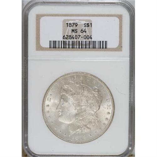 <B>1879 $1 MS64 NGC.</B></I> NGC Census: (3077/590). PCGS Population (2583/804). Mintage: 14,807,100. Numismedia Wsl. Price for NGC/PCGS coin in MS64: $112. (#7084)<BR><BR><b>Shipping:</b> Coins & Currency (<a target="_blank" href="http://www.heritageauctions.com/common/shipping.php">view shipping information</a>)