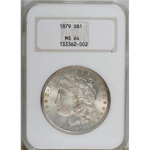 <B>1879 $1 MS64 NGC.</B></I> NGC Census: (3095/601). PCGS Population (2630/823). Mintage: 14,807,100. Numismedia Wsl. Price for NGC/PCGS coin in MS64: $112. (#7084)<BR><BR><B>Coin Engraver:</B> George T. Morgan<BR><BR><b>Shipping:</b> Coins & Currency (<a target="_blank" href="http://www.heritageauctions.com/common/shipping.php">view shipping information</a>)