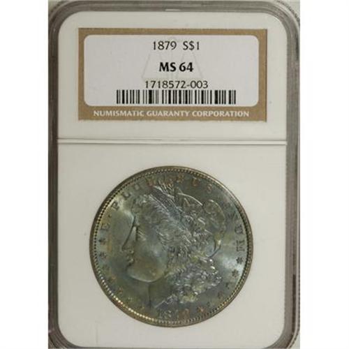<B>1879 $1 MS64 NGC.</B></I> NGC Census: (3095/601). PCGS Population (2630/823). Mintage: 14,807,100. Numismedia Wsl. Price for NGC/PCGS coin in MS64: $112. (#7084)<BR><BR><B>Coin Engraver:</B> George T. Morgan<BR><BR><b>Shipping:</b> Coins & Currency (<a target="_blank" href="http://www.heritageauctions.com/common/shipping.php">view shipping information</a>)