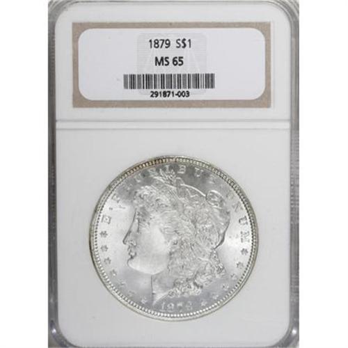 <B>1879 $1 MS65 NGC.</B></I> . NGC Census: (553/47). PCGS Population (784/80). Mintage: 14,807,100. Numismedia Wsl. Price for NGC/PCGS coin in MS65: $660. (#7084)<BR><BR><B>Coin Engraver:</B> George T. Morgan<BR><BR><b>Shipping:</b> Coins & Currency (<a target="_blank" href="http://www.heritageauctions.com/common/shipping.php">view shipping information</a>)