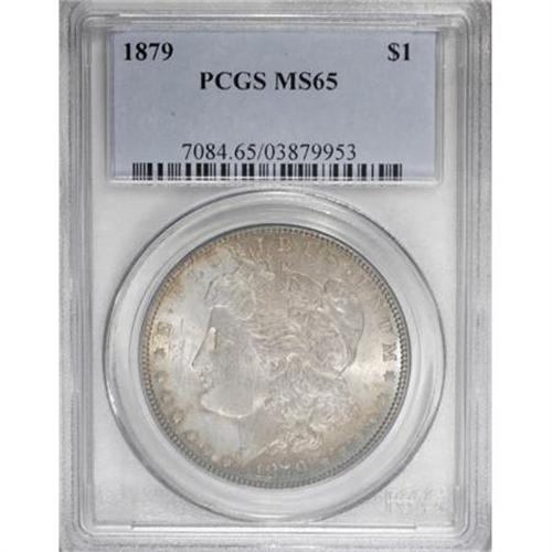 <B>1879 $1 MS65 PCGS.</B></I> This is a visually alluring Gem that exhibits an attractive coating of original patina over both sides. The colors include a mixture of cobalt-blue and red-brown, with creamy rose-gray toning across the centers. It is boldly struck and minimally marked, as expected for the grade. <BR><BR><B>Coin Engraver:</B> George T. Morgan<BR><BR><b>Shipping:</b> Coins & Currency (<a target="_blank" href="http://www.heritageauctions.com/common/shipping.php">view shipping information</a>)
