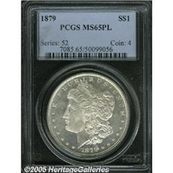 <B>1879<img border='0' src='http://www.heritagecoins.com/images/star.gif' width=10 height=10>$1 MS65 Prooflike PCGS.</B></I> Untoned surfaces offer nice field to design contrast. Sharply struck and minimally abraded.