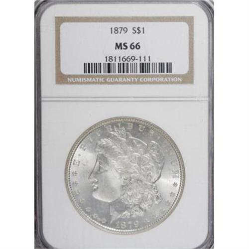 <B>1879 $1 MS66 NGC.</B></I> This flashy Premium Gem dollar is essentially white and untoned, with cartwheel luster in the fields and a bright, clean overall appearance. There is a touch of softness on the hair detail just above Liberty's ear, but the other design elements are boldly struck. The 1879 Morgan dollar is surprisingly challenging in higher Mint State grades. Census: 44 in 66, 4 finer (6/07). <BR><I>From the Reuben Reinstein Collection.</B></I><BR><BR><b>Shipping:</b> Coins & Currency (<a target="_blank" href="http://www.heritageauctions.com/common/shipping.php">view shipping information</a>)