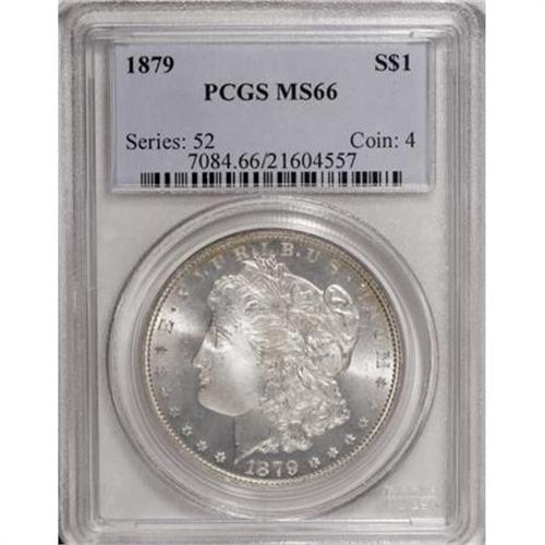 <B>1879 $1 MS66 PCGS.</B></I> Both sides of this Premium Gem are fully brilliant and highly lustrous with frosty silver surfaces. As usual for the design, the hair strands over Liberty's ear are a trifle weak, but all other details are boldly defined. In sum, an attractive exemplar from this popular earlier Morgan dollar issue. PCGS has certified just one finer representative (1/08).<BR><I>From The Oxford Collection.</B></I><BR><BR><B>Coin Engraver:</B> George T. Morgan<BR><BR><b>Shipping:</b> Coins & Currency (<a target="_blank" href="http://www.heritageauctions.com/common/shipping.php">view shipping information</a>)