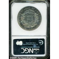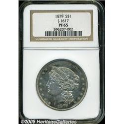 <B>1879<img border='0' src='http://www.heritagecoins.com/images/star.gif' width=10 height=10>$1 Metric Dollar, Judd-1617, Pollock-1813, R.4, PR65 NGC.</B></I> This Metric dollar design features Liberty wearing a coronet with a border of pearls, and it is similar to the design used on the 1877 $50 half union patterns. Allegedly designed by William Barber, this may have actually been executed by his son Charles. The reverse is quite elaborate with a partial wreath of cotton and corn tied at the base, a ribbon, and with DEO EST GLORIA on a tablet above. Struck in silver with a reeded edge. This sparkling Gem has nicely reflective fields and most of each side is brilliant with a significant peripheral presence of golden and blue toning.