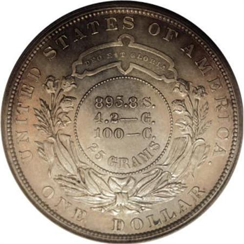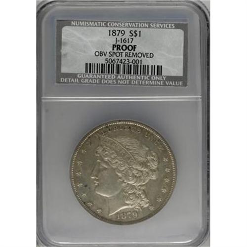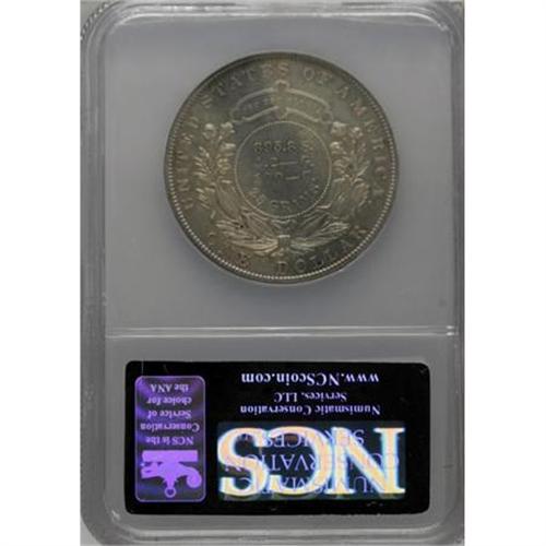<B>1879 $1 Metric Dollar, Judd-1617, Pollock-1813, R.4--Obverse Spot Removed--NCS. PR60 Details.</B></I> A William Barber design with the head of Liberty facing left, wearing a coronet with the word LIBERTY on it. Above the portrait is E PLURIBUS UNUM, and the date is below. The reverse has the composition of the metric alloy in three lines with the weight below, surrounded by an elaborate wreath of corn and cotton, and a cartouche above with DEO EST GLORIA inside. At the margin is UNITED STATES OF AMERICA and ONE DOLLAR. Struck in goloid alloy (allegedly) with a reeded edge. These pieces have not undergone metallurgical testing so it is uncertain if they are actually goloid or coin silver. The grayish-tan surfaces display shallow mirrors in the fields, with a few hairlines on each side and a patch of tooling marks near obverse star 4 where someone attempted to remove a small brown spot.<BR><BR><b>Shipping:</b> Coins & Currency (<a target="_blank" href="http://www.heritageauctions.com/common/shipping.php">view shipping information</a>)