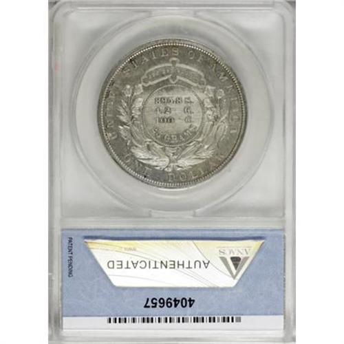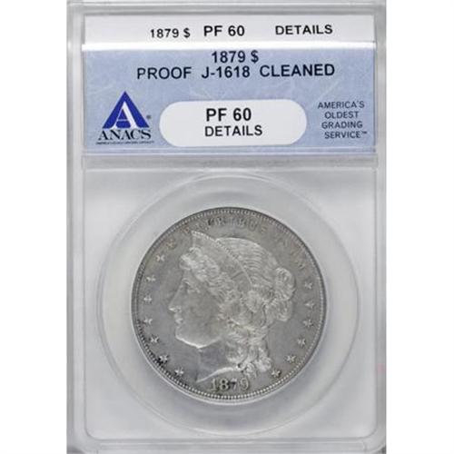 <B>1879 $1 Metric Dollar, Judd-1618, Pollock-1813, R.5--Cleaned--ANACS. PR60 Details.</B></I> William Barber's Metric Dollar with Liberty wearing a coronet with a border of pearls. The reverse is quite elaborate with a partial wreath of cotton and corn tied at the base, a ribbon, and with DEO EST GLORIA on a tablet above. Struck in standard silver with a reeded edge. The obverse is slightly subdued but is hairline-free. The central reverse displays horizontal hairlines. Well struck, and lightly toned in caramel-gold and powder-blue.<BR><BR><b>Shipping:</b> Coins & Currency (<a target="_blank" href="http://www.heritageauctions.com/common/shipping.php">view shipping information</a>)