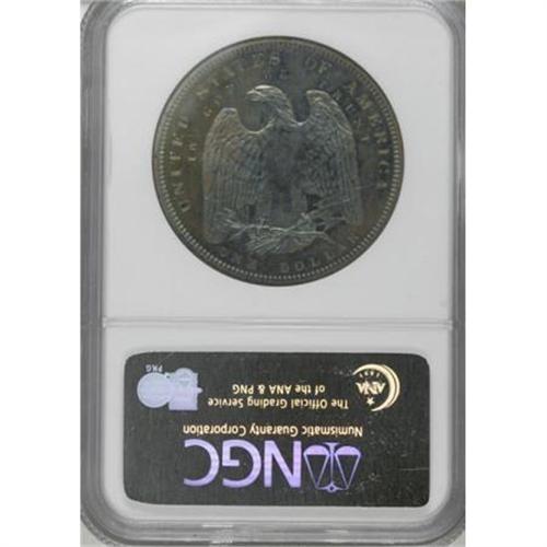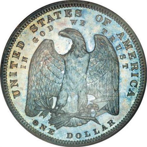 <B>1879 $1 Morgan Dollar, Judd-1614, Pollock-1810, Low R.7, PR65 Brown NGC.</B></I> The obverse is the regular die for the Morgan silver dollar. The reverse is roughly similar to the Morgan reverse, but the eagle's wings are lowered rather than raised, with the eagle somewhat larger and the body shaped differently--less tapered. ONE DOLLAR is beneath in tiny letters, and IN GOD WE TRUST encircles the eagle's head, but not in a script font as on the regular issue. UNITED STATES OF AMERICA is roughly the same appearance as on the final product. Struck in copper with a reeded edge.<BR> The great spate of patterns that burst forth from the Mint in 1879, most famously including the four dollar stella in two designs, is enduringly popular with collectors. Why there were so many dollar patterns issued in the year after the (mostly) unwanted Morgan dollars began filling up Treasury coffers is not entirely explained by the goloid dollars experiment. It appears that there was competition, healthy or not, between Mint Chief Engraver Charles T. Barber and the newly hired (in 1876) Assistant Engraver George T. Morgan. And some Mint personnel of the era were not above producing numismatic delicacies, some clandestine, some not, for public or private gain.<BR> This piece boasts lovely, deep toning in shades of aqua and gold on both sides, but considerable luster ensues from beneath. Perusal with a loupe fails to reveal any mentionable distractions, save for a small contact mark on Liberty's cheek. One of the two finest certified at NGC in PR65, regardless of color designation (12/07).<BR><BR><b>Shipping:</b> Coins & Currency (<a target="_blank" href="http://www.heritageauctions.com/common/shipping.php">view shipping information</a>)