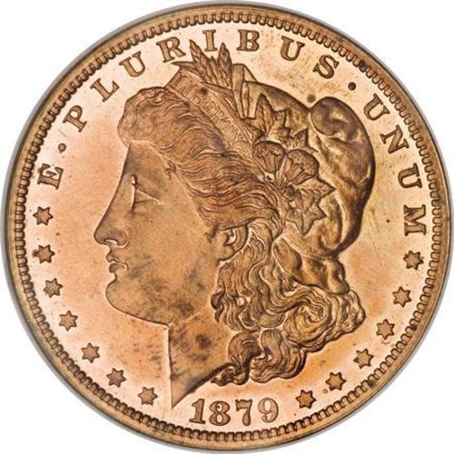 <B>1879 $1 Morgan Dollar, Judd-1614, Pollock-1810, R.6, PR65 Red NGC.</B></I> A regular issue Morgan dollar obverse is paired with a pattern reverse. The eagle is large, and its open wings are set lower in the field. ONE DOLLAR is in small letters, and IN GOD WE TRUST is widely spread along the upper periphery. Struck in copper with a reeded edge. A beautiful orange-red Gem that has an exemplary strike and only moderate carbon.<BR><BR><b>Shipping:</b> Coins & Currency (<a target="_blank" href="http://www.heritageauctions.com/common/shipping.php">view shipping information</a>)