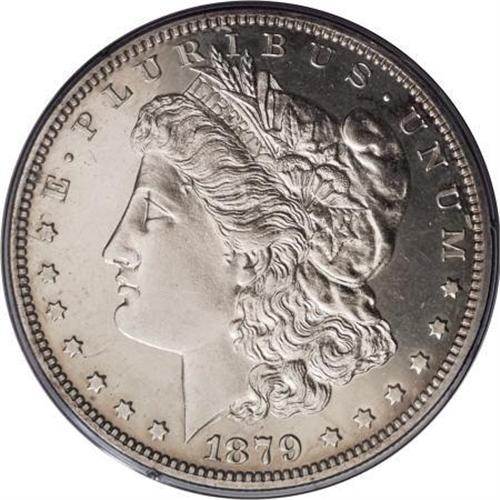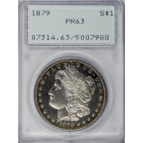 <B>1879 $1 PR63 PCGS.</B></I> Delicate almond-gold toning visits the margins, while the centers are brilliant. Crisply struck with only minor incompleteness on the hair above the ear. The devices are lightly frosted. Careful examination beneath a loupe locates the occasional unimportant field hairline. Housed in a first generation holder.<BR><BR><B>Coin Engraver:</B> George T. Morgan<BR><BR><b>Shipping:</b> Coins & Currency (<a target="_blank" href="http://www.heritageauctions.com/common/shipping.php">view shipping information</a>)