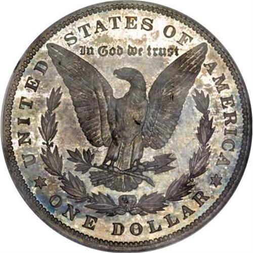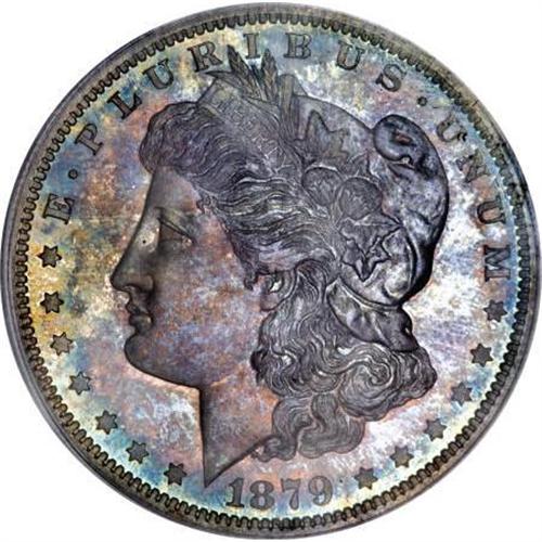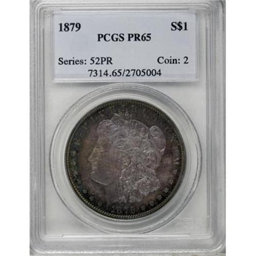 <B>1879 $1 PR65 PCGS.</B></I> A deeply toned Gem with deep violet-gray color at the centers, turning into rich blue and green hues at the edges. The toning somewhat inhibits the reflectivity of the fields and the strike, while bold, provides incomplete details in the hair above Liberty's ear on the obverse. Extremely clean and handsome in its overall appearance. Proof 1879 Dollars show an interesting bit of repunching on the reverse. This is most readily noticeable on the base of the E and R in AMERICA. The R appears to have been patched from a broken punch. This same reverse was used to strike some of the proof Dollars from 1880 as well.<BR><BR><B>Coin Engraver:</B> George T. Morgan<BR><BR><b>Shipping:</b> Coins & Currency (<a target="_blank" href="http://www.heritageauctions.com/common/shipping.php">view shipping information</a>)