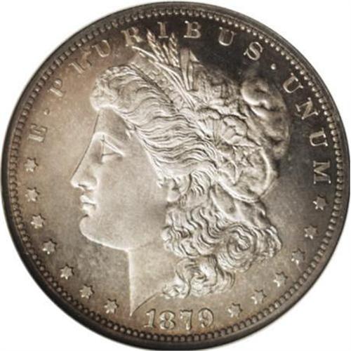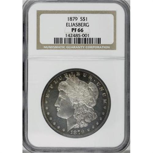 <B>1879 $1 PR66 NGC.</B></I> Ex: Eliasberg. Subdued violet and gray patina adorns the obverse, while deep cobalt-blue and purple coloration fills the reverse fields. While David Bowers (2005) contends that most 1879 proof dollars "... are of low contrast," the sharply impressed motifs of this example stand out against the reflective fields. A couple of minor obverse marks do not detract in the least from the coin's outstanding eye appeal. Census: 30 in 66, 22 finer (8/07).<BR><BR><B>Coin Engraver:</B> George T. Morgan<BR><BR><b>Shipping:</b> Coins & Currency (<a target="_blank" href="http://www.heritageauctions.com/common/shipping.php">view shipping information</a>)