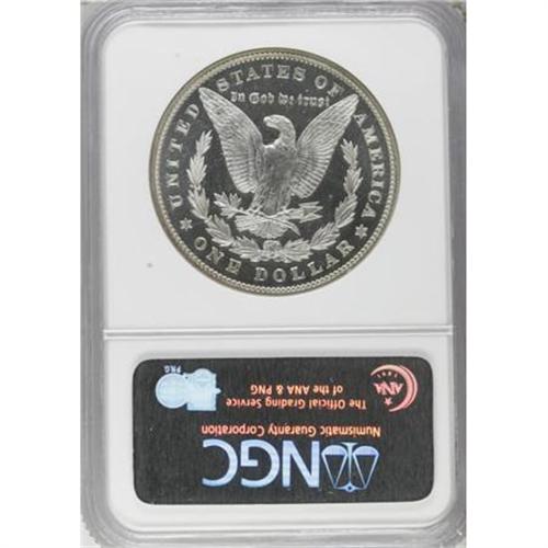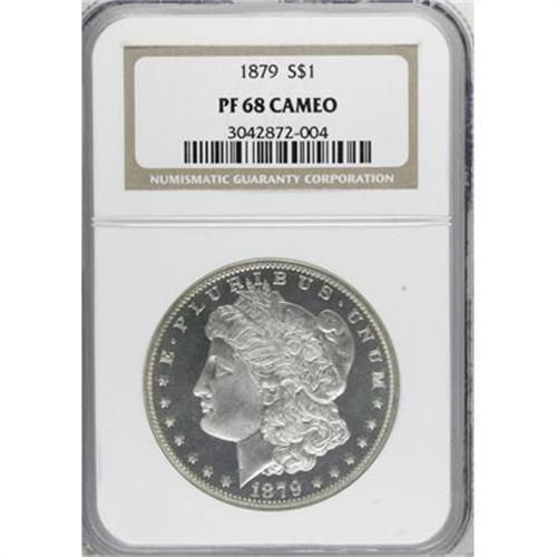 <B>1879 $1 PR68 Cameo NGC.</B></I> Records indicate a mintage of 1,100 proof Morgan dollars for 1879, a smaller figure than the number of proof Trade dollars for that year, though much larger than the meager production of proof gold dollars. The specimen offered here ranks among the finest survivors of this second-year issue. The steel-gray fields have strong reflectivity with only one minor, isolated spot of haze to the right of the arrowheads. A splash of cherry-red at the E in ONE adds a touch of color. The devices have solid detail overall, though the hair above the ear is a trifle weak as always, and light, even frost contributes to this coin's distinct contrast. Both sides are carefully preserved, with only two unimportant contact marks in the upper reverse fields. NGC has graded just three pieces as PR68 Cameo, while PCGS acknowledges just one, with no finer Cameo examples certified by either service (5/07).<BR><BR><b>Shipping:</b> Coins & Currency (<a target="_blank" href="http://www.heritageauctions.com/common/shipping.php">view shipping information</a>)