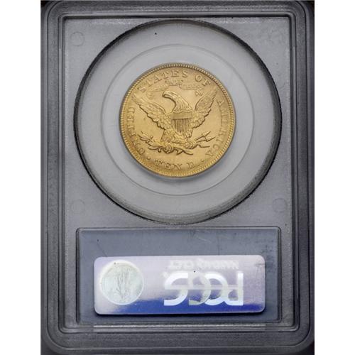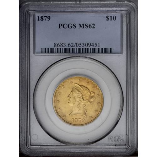 <B>1879<$10> MS62 PCGS.</B></I> A meticulously struck and satiny apricot-gold example that lacks mentionable marks. Despite a mintage of close to 400,000 pieces, the 1879 is nonetheless scarce in Mint State. Population: 44 in 62, 34 finer (3/06). <BR><BR><B>Important notice:</B> Heritage usually auctions material at the rate of 200-250 lots per hour. On some occasions eBay Live bid software or the Internet may not be able to keep up with the pace of the auction. We recommend placing a realistic absentee bid now as insurance to avoid disappointment. Occasionally the auctioneer may eliminate or reject an eBay Live bid, and the auctioneer may also reopen a lot after the close of the eBay live bidding (usually because we missed an audience bid), and may reject your bid even if it shows you as the winning bidder. By bidding via eBay Live, you agree that Heritage may award the lot to another bidder at its sole discretion under the circumstances described above or any other reasonable circumstances. Since eBay bids are not shown to us until we open the lot on the floor, we treat those bids just like floor bids. In most cases the floor responds before the eBay bid is presented to us, due to Internet lag time, so for consistency we have made it a policy that floor bids are always considered first over tie eBay live bids. Also please note that all Heritage lots purchased through eBay Live carry a 20% Buyer's Premium. Please make sure you read the Terms and Conditions before you bid. This lot is being auctioned in conjunction with a live floor auction by Heritage Galleries & Auctioneers. All final auction and invoice information will be supplied by Heritage Galleries & Auctioneers, and all other information should be considered preliminary. Lot:3982 <BR><BR><B>Winning Notification and Billing:</B> After the FINAL session in this auction is complete, Heritage will send e-mail and snail mail invoices. This process normally takes several days. All final auction and invoice information will be supplied by Heritage Galleries & Auctioneers, and all other information should be considered preliminary. <BR><BR>This auction will be conducted on a live auction floor and over the Internet through eBay Live. If you choose to place an absentee bid, please take a moment to <font color='#0000ff'><u><a href='http://pages.ebay.com/liveauctions/help/before/laabsentee.html'>learn how eBay Live absentee bidding works</a></u></font><font color='#000000'>