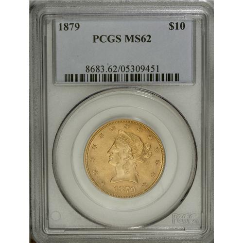 <B>1879 $10 MS62 PCGS.</B></I> A meticulously struck and satiny apricot-gold example that lacks mentionable marks. Despite a mintage of close to 400,000 pieces, the 1879 is nonetheless elusive in Mint State. Population: 45 in 62, 33 finer (11/06).<BR><BR><b>Shipping:</b> Coin/Currency (<a target="_blank" href="http://www.heritageauctions.com/common/shipping.php">view shipping information</a>)