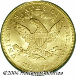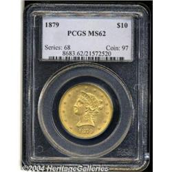 <B>1879<$10> MS62 PCGS.</B></I> Possible 1879/8. Breen-6993. This mysterious overdate has been known for decades, but never officially recognized. In part this is because of its extreme scarcity--only two Uncirculated pieces were known to Breen when he published his 1988 <I>Encyclopedia.</B></I> The diagnostics listed for B-6993 are: "Part of lower r. loop of 8 within loop of 9." (This is apparently a typo as it would be the lower left loop of the 8 that would show in the bottom of the 9). A strong magnifier will reward the viewer when examining this piece. There is definitely something in the lower loop of the 9 and it is closed on the left side, as the lower loop of an 8 would be. This underdigit, if we may call it that, is actually quite sharp, and we would speculate that this may be an early die state of this overdate.<BR> The coin otherwise is a pleasing for the grade. The luster is a bit weak and the strike a little soft on the stars, but all in all a good coin for the grade with light, original, variegated coloration. <BR><BR><B>Important notice:</B> Heritage usually auctions material at the rate of 200-250 lots per hour. On some occasions eBay Live bid software or the Internet may not be able to keep up with the pace of the auction. We recommend placing a realistic absentee bid now as insurance to avoid disappointment. Occasionally the auctioneer may eliminate or reject an eBay Live bid, and the auctioneer may also reopen a lot after the close of the eBay live bidding (usually because we missed an audience bid), and may reject your bid even if it shows you as the winning bidder. By bidding via eBay Live, you agree that Heritage may award the lot to another bidder at its sole discretion under the circumstances described above or any other reasonable circumstances. Since eBay bids are not shown to us until we open the lot on the floor, we treat those bids just like floor bids. In most cases the floor responds before the eBay bid is presented to us, due to Internet lag time, so for consistency we have made it a policy that floor bids are always considered first over tie eBay live bids. Also please note that all Heritage lots purchased through eBay Live carry a 20% Buyer's Premium. Please make sure you read the Terms and Conditions before you bid. </span></font></tr></table></td></tr></table>