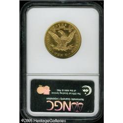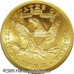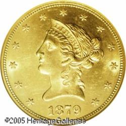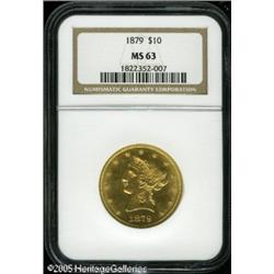 <B>1879 $10 MS63 NGC.</B></I> Extra metal inside the lower loop of the 9 led Walter Breen to describe this variety as an 1879/8 Overdate, which he listed in his <I>Encyclopedia</B></I> as number 6993. He called this variety Extremely Rare although it is much more common today. What is not common is the condition of this example which is fully Mint State with satiny yellow-gold luster, the devices ever so slightly lighter in appearance. Minor surface marks are consistent with the grade of this example. Population: 34 in 63, 3 finer (1/05). Lot:8771