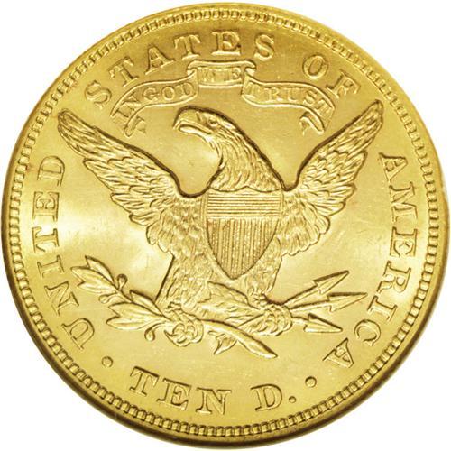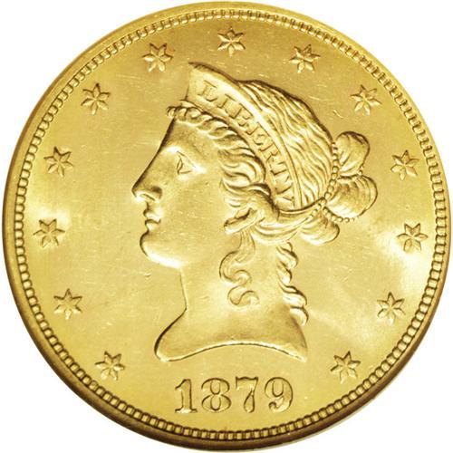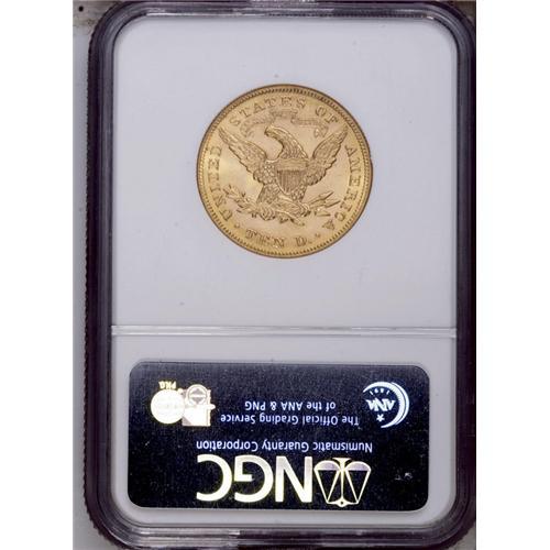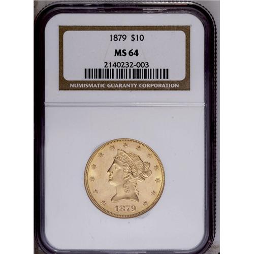 <B>1879<$10> MS64 NGC.</B></I> Possible 1879/8. Breen-6993. This mysterious overdate has been known for decades, but never officially recognized. In part this is because of its extreme scarcity--only two Uncirculated pieces were known to Breen when he published his 1988 <I>Encyclopedia.</B></I> The diagnostics listed for B-6993 are: "Part of lower r. loop of 8 within loop of 9." (This is apparently a typo as it would be the lower left loop of the 8 that would show in the bottom of the 9). A strong magnifier will reward the viewer when examining this piece. There is definitely something in the lower loop of the 9 and it is closed on the left side, as the lower loop of an 8 would be. This underdigit, if we may call it that, is actually quite sharp, and we would speculate that this may be an early die state of this variety.<BR> The coin otherwise is very pleasing for the grade. The luster is bright and imparts a semi-reflective sheen in the fields. The strike a little soft on a couple of the stars, but all in all a good coin for the grade with light, original, yellow-golden coloration. Census: 4 in 64, 1 finer (2/06).