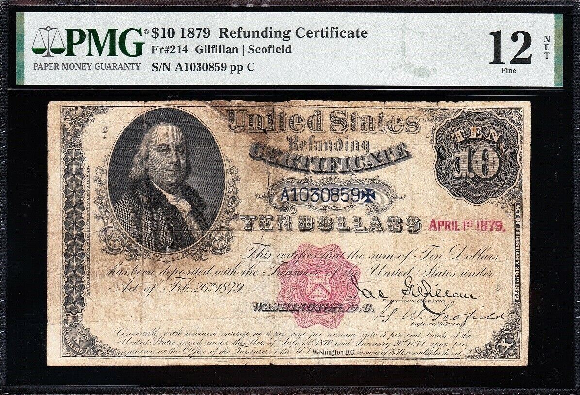 One 1879 $10 Refunding Certificate PMG 12NET.