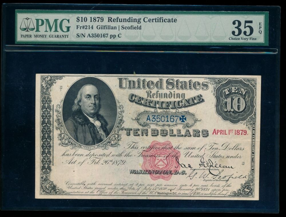 One 1879 $10 Refunding Certificate PMG 35EPQ.