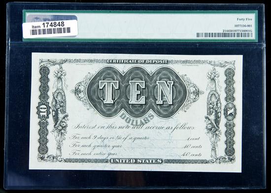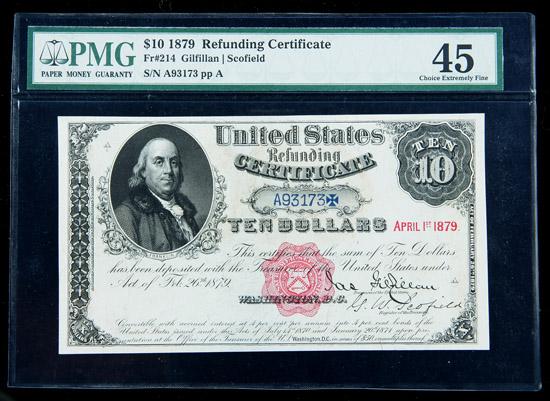 1879, $10 Refunding Certificate. PMG Choice Extremely Fine 45. . Fr-214. Several decades ago, this inegmatic issue was considered rare in all grades. Most examples were well worn or damaged. Since then, a small group of high grade examples has surfaced, giving most collectors a fair chance to obtain one. This collection includes four such notes, an unusual opportunity in any circumstance. This piece is bright, broadly margined, and appears to be much finer at a glance.