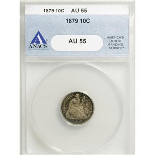 <B>1879 10C AU55 ANACS.</B></I> NGC Census: (0/143). PCGS Population (3/226). Mintage: 14,000. Numismedia Wsl. Price for NGC/PCGS coin in AU55: $417. (#4687)<BR><BR><B>Coin Engraver:</B> Christian Gobrecht<BR><BR><b>Shipping:</b> Coins & Currency (<a target="_blank" href="http://www.heritageauctions.com/common/shipping.php">view shipping information</a>)