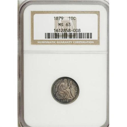 <B>1879 10C MS63 NGC.</B></I> Gunmetal-blue, orange, and mauve patina cover each side of this Select dime. A few minor marks are noted on the well struck surfaces.<BR><BR><B>Coin Engraver:</B> Christian Gobrecht<BR><BR><b>Shipping:</b> Coins & Currency (<a target="_blank" href="http://www.heritageauctions.com/common/shipping.php">view shipping information</a>)