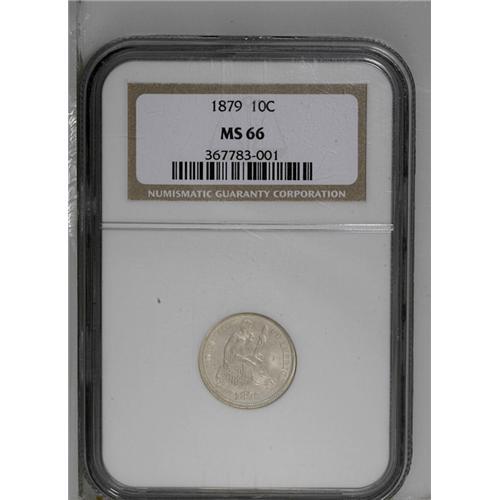 <B>1879<10C> MS66 NGC.</B></I> One of a tiny original mintage of 14,000 pieces, this issue has long been popular. This example is mostly white with just a hint of golden patina, nice definition, and semi-prooflike surfaces. Census: 36 in 66, 32 finer (7/06).