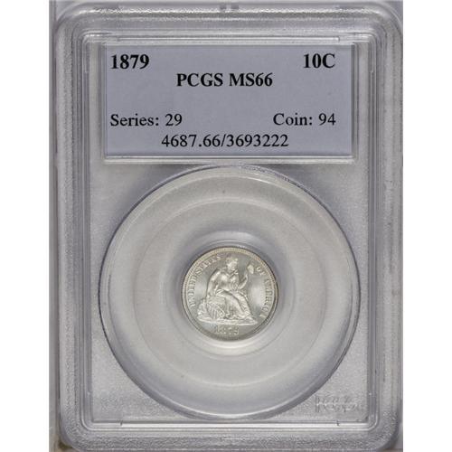 <B>1879<10C> MS66 PCGS.</B></I> Fortin-104a. The 18 in the date is sharply repunched. This nearly brilliant Premium Gem provides potent luster, and the strike is bold save for Liberty's hair and a few cereal grains within the wreath. Population: 46 in 66, 22 finer (5/06).