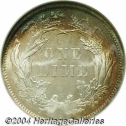 <table><tr><td><table><tr><td>1879 10C MS67 NGC. First year of reduced production of subsidiary silver coinage, only 14,000 business strikes were minted this year. This piece is extraordinary. The striking details are nearly complete, save for a bit of detail at the top of the obverse. The fields show a mixture of cartwheel luster and semi-prooflikeness. The surfaces are nearly perfect with the only flaws being a couple of microscopic abrasions in the right obverse field. A peripheral ring of golden-brown, lilac, and sea-green lends originality to each side. Superb quality. Population: 22 in 67, 3 finer (3/04). <BR><BR><B>Important notice:</B> Heritage usually auctions material at the rate of 200-250 lots per hour. On some occasions eBay Live bid software or the Internet may not be able to keep up with the pace of the auction. We recommend placing a realistic absentee bid now as insurance to avoid disappointment. Occasionally the auctioneer may eliminate or reject an eBay Live bid, and the auctioneer may also reopen a lot after the close of the eBay live bidding (usually because we missed an audience bid), and may reject your bid even if it shows you as the winning bidder. By bidding via eBay Live, you agree that Heritage may award the lot to another bidder at its sole discretion under the circumstances described above or any other reasonable circumstances. Since eBay bids are not shown to us until we open the lot on the floor, we treat those bids just like floor bids. In most cases the floor responds before the eBay bid is presented to us, due to Internet lag time, so for consistency we have made it a policy that floor bids are always considered first over tie eBay live bids. Also please note that all Heritage lots purchased through eBay Live carry a 20% Buyer's Premium. Please make sure you read the Terms and Conditions before you bid. <BR><BR><B>IMPORTANT ANNOUNCEMENT ABOUT RESERVES:</B> Heritage now divulges all reserves on its web site 7 days before every auction. If you want to know whether the reserve on this lot has been met, and if not, what the reserve amount is, please visit this lot page on the HeritageCoin.com web site, or email: bid@HeritageGalleries.com </span></font></td></tr></table></td></tr></table>
