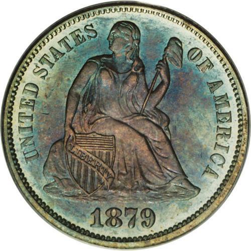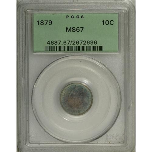 <B>1879 10C MS67 PCGS.</B></I> Lovely rose-gray and electric-green patina covers each side of this virtually pristine Superb Gem. Encapsulated in a green label PCGS holder, it is sharply struck and only shows a few tiny marks, in the obverse fields. A mere 14,000 business strike dimes were minted this year. Population: 20 in 67, 0 finer (12/06).<BR><BR><b>Shipping:</b> Coin/Currency (<a target="_blank" href="http://www.heritageauctions.com/common/shipping.php">view shipping information</a>)
