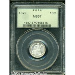 <table><tbody><tr><td><table> <TR><TD width="100%"><TABLE cellSpacing=1 cellPadding=3 width="100%" border=0><TBODY><TR><TD width="100%" bgColor=#79735c><FONT face=arial color=#ffffff size=3><B>Description</B> </FONT></TD></TR><TR><TD width="100%" bgColor=#ffffff><FONT face=arial size=2><B>1879 10C MS67 PCGS.</B></I> First year of reduced production of subsidiary silver coinage, only 14,000 business strikes were minted this year. This piece is extraordinary. The striking details are complete, and the fields show a mixture of cartwheel luster and semi-prooflikeness. The surfaces are nearly perfect with the only flaws being a couple of microscopic abrasions in the right obverse field. As an identifier, one tiny black spot is noted to the right of the E of DIME. Both sides are fully brilliant and completely untoned. Superb quality. Population: 18 in 67, 0 finer (10/03). </FONT></TD></TR></TBODY></TABLE></TD></TR></TBODY></TABLE><BR><A name=PricesRealized></A><TABLE cellSpacing=0 cellPadding=0 width="100%" bgColor=#000000 border=0><TBODY><TR><TD width="100%"><TABLE cellSpacing=1 cellPadding=3 width="100%" border=0><TBODY><TR><TD width="100%" bgColor=#79735c><A name=PR><FONT face=arial color=#ffffff size=3><B>Previous Prices from Heritage Auctions</B> </FONT></A></TD></TR><TR><TD bgColor=#f6f6ed><TABLE cellSpacing=0 cellPadding=0 width="100%" border=1><TBODY><TR><TD align=middle width="33%"><B>Date</B></TD><TD align=middle width="33%"><B>Service</B></TD><TD align=middle width="33%"><B>Price</B></TD></TR><TR bgColor=whitesmoke><TD width="33%"><B>09/26/2000</B></TD><TD width="33%">NGC</TD><TD width="33%">$1,700.00</TD></TR><TR bgColor=whitesmoke><TD width="33%"><B>03/01/2003</B></TD><TD width="33%">NGC</TD><TD width="33%">$1,725.00</TD></TR><TR bgColor=whitesmoke><TD width="33%"><B>01/11/2003</B></TD><TD width="33%">NGC</TD><TD width="33%">$1,725.00</TD></TR><TR bgColor=whitesmoke><TD width="33%"><B>10/06/2000</B></TD><TD width="33%">NGC</TD><TD width="33%">$1,897.50</TD></TR><TR bgColor=whitesmoke><TD width="33%"><B>08/13/1999</B></TD><TD width="33%">NGC</TD><TD width="33%">$2,990.00</TD></TR><TR bgColor=whitesmoke><TD width="33%"><B>08/07/1998</B></TD><TD width="33%">NGC</TD><TD width="33%">$1,955.00</TD></TR><TR bgColor=whitesmoke><TD width="33%"><B>09/21/1996</B></TD><TD width="33%">PCGS</TD><TD width="33%">$2,640.00</TD></TR><TR bgColor=whitesmoke><TD width="33%"><B>02/06/1995</B></TD><TD width="33%">PCGS</TD><TD width="33%">$3,685.00</TD></TR><TR bgColor=whitesmoke><TD width="33%"><B>01/04/1995</B></TD><TD width="33%">PCGS</TD><TD width="33%">$3,080.00</TD></TR><TR bgColor=whitesmoke><TD width="33%"><B>02/16/2000</B></TD><TD width="33%">PCGS</TD><TD width="33%">$2,415.00</TD></TR><TR bgColor=whitesmoke><TD width="33%"><B>06/01/1998</B></TD><TD width="33%">PCGS</TD><TD width="33%">$4,620.00</TD></TR></TBODY></TABLE></TD></TR><TR><TD bgColor=#ffffff><FONT face=arial size=1 ?>PLEASE NOTE: All prices realized reflect the final hammer price PLUS the buyer's premium in auctions that charge a buyer's premium. Each item has a notation at the top of the listing indicating whether that lot included a buyer's premium. Example: A item that sells with a final hammer price of $100 and a 20% buyer's premium will display with a price realized of $120. All information listed is intended to be as accurate as possible, but errors are possible. Please use this guide carefully and inform us of any inaccuracies. </FONT></TD></TR></TBODY></TABLE></TD></TR></TBODY></TABLE><BR><TABLE cellSpacing=0 cellPadding=0 width="100%" bgColor=#000000 border=0><TBODY><TR><TD width="100%"><TABLE cellSpacing=1 cellPadding=3 width="100%" border=0><TBODY><TR><TD width="100%" bgColor=#79735c colSpan=6><FONT face=arial color=#ffffff size=3><B>Price Guide*</B> </FONT></TD></TR><TR bgColor=#f6f6ed><TD align=middle><B>Grade</B> </TD><TD align=middle><B>Coin World<BR>(Trends)</B> </TD><TD align=middle><B>Numismedia<BR>Retail</B> </TD><TD align=middle><B>Numismedia<BR>Wholesale</B> </TD><TD align=middle><B>Coin<BR>Universe</B> </TD><TD align=middle><B>Heritage<BR>Value Index</B> </TD></TR><TR bgColor=#ffffff><TD align=middle>66</TD><TD align=right>---</TD><TD align=right>---</TD><TD align=right>$1,225.00</TD><TD align=right>$1,600.00</TD><TD align=right>$1,422.50</TD></TR><TR style="FONT-WEIGHT: bold" bgColor=#cccfdd><TD align=middle>67</TD><TD align=right>---</TD><TD align=right>---</TD><TD align=right>$2,550.00</TD><TD align=right>$3,700.00</TD><TD align=right>$2,270.00</TD></TR><TR bgColor=#ffffff><TD align=middle>68</TD><TD align=right>---</TD><TD align=right>---</TD><TD align=right>$8,850.00</TD><TD align=right>---</TD><TD align=right>---</TD></TR><TR bgColor=#ffffff><TD colSpan=6><FONT size=1>*All information listed is intended to be as accurate as possible, but errors are possible. No item may be returned or refused based on this information which is provided as a service to our customers. You should contact each pricing source directly to determine the accuracy of this information. </FONT></TD></TR></TBODY></TABLE></TD></TR></TBODY></TABLE><BR><TABLE cellSpacing=0 cellPadding=0 width="100%" bgColor=#000000 border=0><TBODY><TR><TD width="100%"><TABLE cellSpacing=1 cellPadding=3 width="100%" border=0><TBODY><TR><TD width="100%" bgColor=#79735c><FONT face=arial color=#ffffff size=3><B>Population Guide</B> </FONT></TD></TR><TR bgColor=#ffffff><TD align=middle><!-- Begin Output of Population Grid--><TABLE cellSpacing=0 cellPadding=0 width="100%" border=0><TBODY><TR><TD vAlign=center><TABLE cellSpacing=0 width="100%" border=1 cellsadding="3"><TBODY><TR><TD vAlign=center><TABLE cellSpacing=0 cellPadding=3 width="100%" border=1><TBODY><TR><TD vAlign=center align=middle bgColor=#f0f1e8 colSpan=2 <CENTER><FONT face=Arial size=2><B>PCGS Pop </B></FONT><CENTER></CENTER></TD><TD vAlign=center align=middle bgColor=#f0f1e8 colSpan=2><CENTER><FONT face=Arial size=2><B>NGC Pop</B></CENTER></FONT></TD></TR><TR><TD vAlign=center><FONT face=Arial s