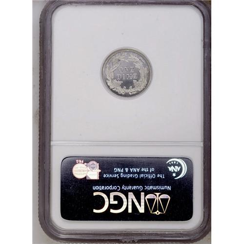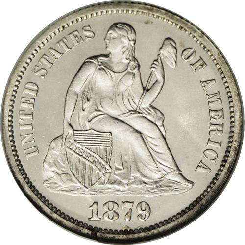 <B>1879<10C> MS67 Prooflike NGC.</B></I> Intense mint frost shimmers over each side of this untoned, ice-white Superb Gem. Liberty's head is notably well detailed. Only close scrutiny with a magnifier allows detection of wispy coin-to-coin marks on the obverse. The glassy fields are highly prooflike. A visually stunning example of this later Seated dime issue. Census: 2 in 67 Prooflike, 1 finer (6/06).