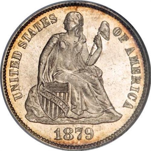 <B>1879 10C MS67 <img src="/images/star.gif" width="10" height="10" alt="" border="0"> NGC.</B></I> The lower loop of the 8 is widely repunched. Golden-brown and cobalt-blue perimeters frame the brilliant fields and devices. Lustrous and nicely struck with clean surfaces. A low mintage date because of heavy Morgan dollar production. Census: 7 in 67 <B><img src="/images/star.gif" width="10" height="10" alt="" border="0"></B></I>, 3 finer as MS68 without a star, and 1 finer as MS68 Prooflike <B><img src="/images/star.gif" width="10" height="10" alt="" border="0"></B></I> (1/08).<I></B></I><BR><BR><B>Coin Engraver:</B> Christian Gobrecht<BR><BR><b>Shipping:</b> Coins & Currency (<a target="_blank" href="http://www.heritageauctions.com/common/shipping.php">view shipping information</a>)