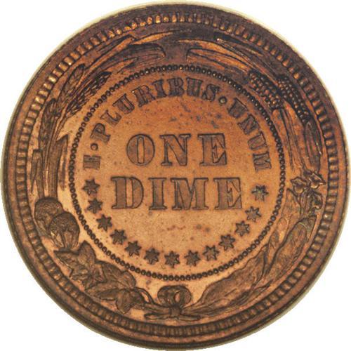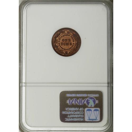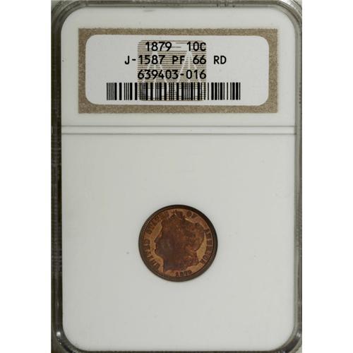 <B>1879 10C Morgan's Liberty Head Dime, Judd-1587, Pollock-1780, High R.6, PR66 Red NGC.</B></I> Morgan's Liberty Head serves the obverse with UNITED STATES OF AMERICA around and the date below. The reverse has a wreath around a circle of dots that contains the motto E PLURIBUS UNUM, 13 stars, and ONE DIME. Struck in copper with a reeded edge. George Morgan's head of Liberty, made famous by the regular issue silver dollar, was used in various sizes for dimes, quarters, and half dollars, in addition to silver dollar patterns. Both sides of this sharply struck piece have brilliant orange mint color with hints of iridescent toning.<BR><I>Ex: Bowers and Merena (9/2001 11/01 ), lot 129.</B></I><BR><I>From The Jones Beach Collection.</B></I><BR><BR><b>Shipping:</b> Coin/Currency (<a target="_blank" href="http://www.heritageauctions.com/common/shipping.php">view shipping information</a>)